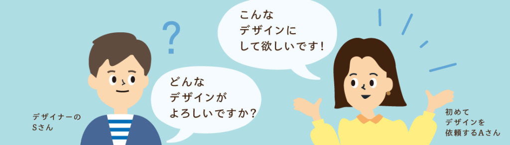 というような悩みや不安を、デザインの依頼をする際に感じたことがある人もいるのではないでしょうか。特に、初めて制作を依頼する人は依頼方法が分からず、なかなか依頼に踏み切れないという人もいるのかと思います。ここでは、そんな不安やお悩みを抱えたAさんとデザイナーSさんの会話を見ながら、上手に依頼内容を伝えるコツをお伝えします。